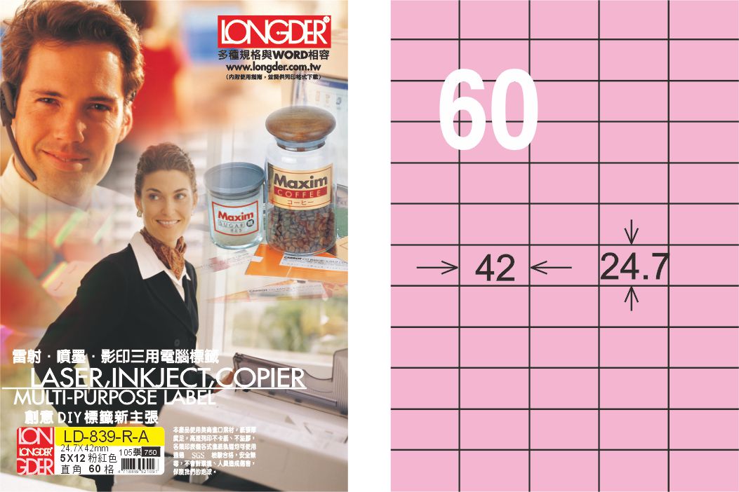 商品名稱:龍德 LD-839-R-A A4三用電腦標籤 粉紅色 / 盒