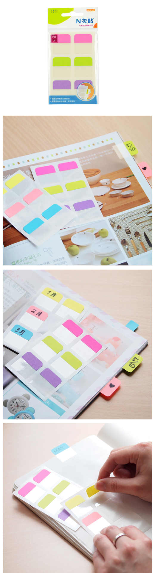 ◎品 名:N次貼 66533 書寫型可再貼分類索引片 28x25mm◎單 位:60片/3色/袋◎型 號:66533◎規 格:28x25mm◎顏 色:洋紅/綠/紫◎特 色:紙張標頭各種筆都好寫,好撕好黏不留痕跡,檔案文件輕鬆收!