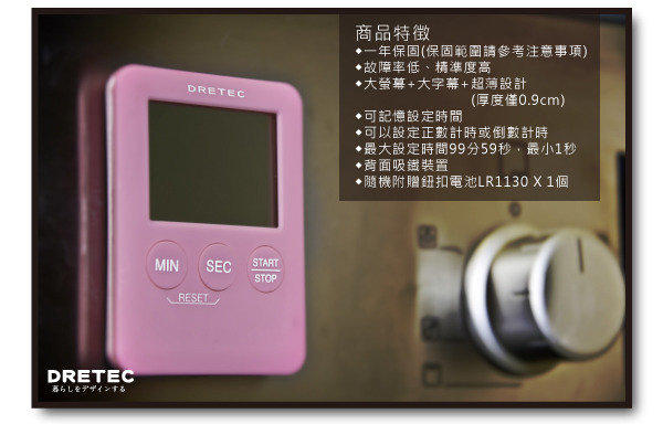 日本DRETEC設計出品銷售,中國大陸製,屬日本當地販售品,配合日本人所需的設計,外觀質感不會像一般雜牌貨,有大螢幕,最大厚度只有9m/m,有磁鐵吸附功能,支援正倒數功能,可記憶設定時間,讓你用起來"感覺很美好",讓你不管是用在廚藝方面的表現等等,絕對給你不一樣的感覺,保證讓人羨慕你的計時器