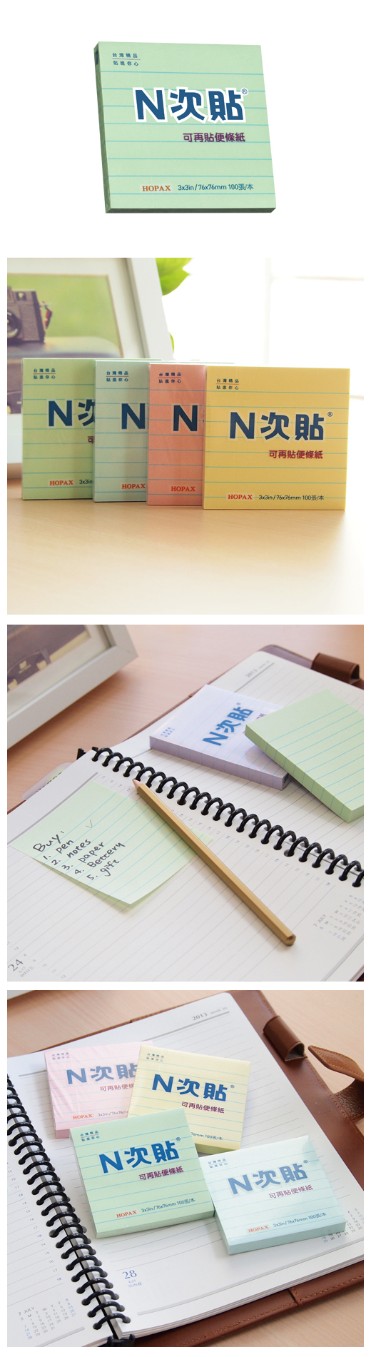 ◎品 名:N次貼 61704 格線型可再貼便條紙 3”x3”(76x76mm),綠◎單 位:100張/本◎型 號:61704◎規 格:3”x3”(76x76mm)◎顏 色:綠◎特 色:N次貼熱銷產品 標記提示輕鬆寫,分類備忘隨手貼 留言、註記、傳遞訊息,格線印刷、條列書寫方便!!