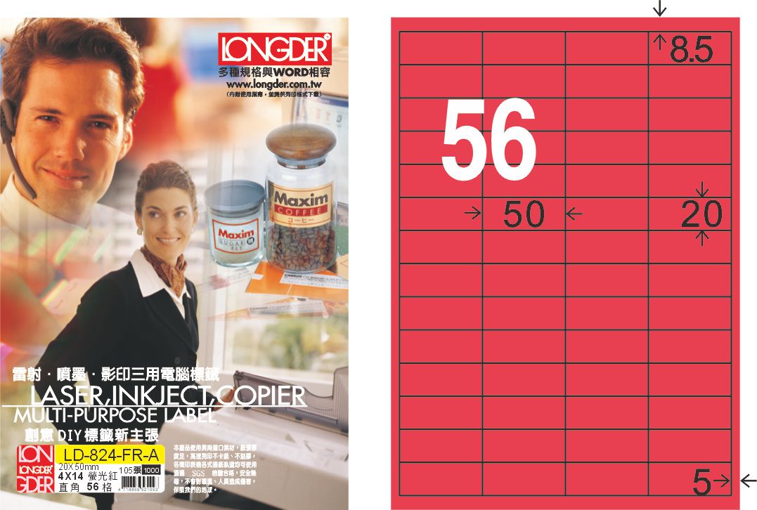 商品名稱:龍德 LD-824-FR-A A4雷射影印標籤 螢光紅 / 盒