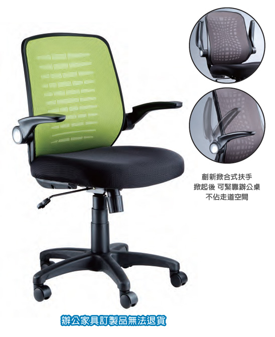 ◎特色:創新掀合式扶手,掀起後可緊靠辦公桌,不佔走道空間
