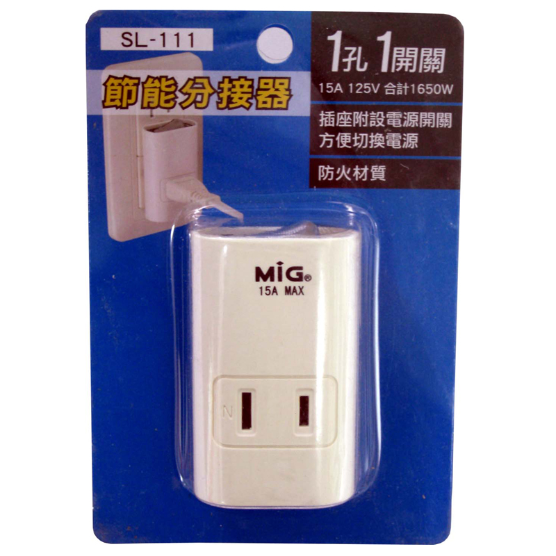 商品名稱:明家 SL-111 1孔1開關節能分接器(璧插)-15A / 個