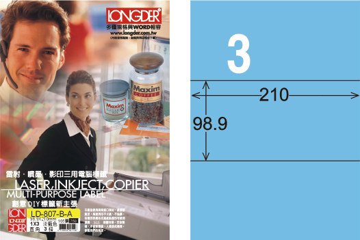 商品名稱:龍德 LD-807-B-A A4三用電腦標籤 淺藍色 / 盒