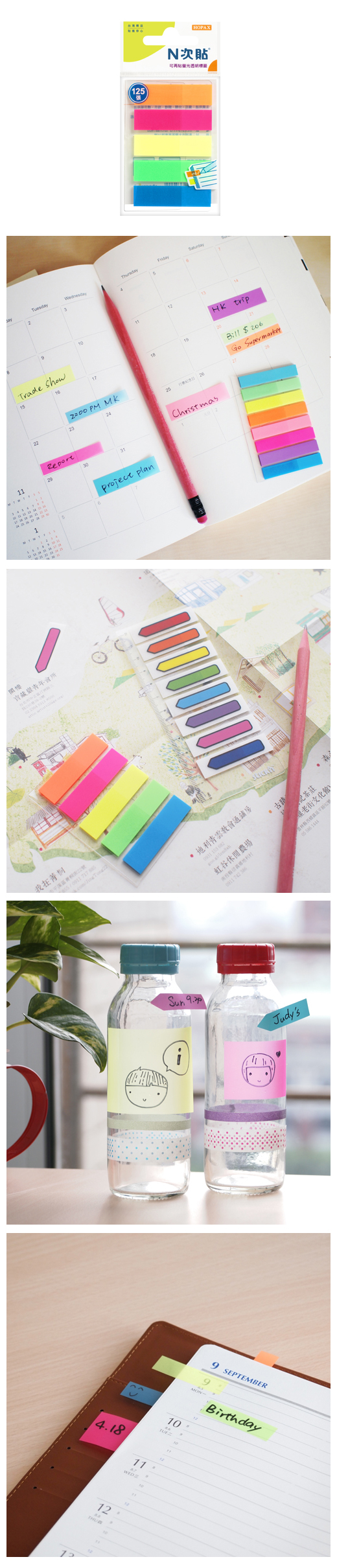 ◎品 名:N次貼 66501 透明螢光可再貼標籤 42x12mm,5色