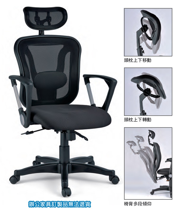 ◎特色:網背椅特點 -- 頭枕可上下移、轉動,椅背多段傾仰