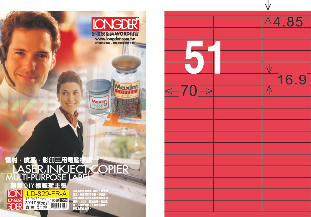 >龍德 LD-829-FR-A A4雷射影印標籤 螢光紅 / 盒