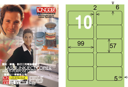 商品名稱:龍德 LD-814-G-A A4三用電腦標籤 淺綠色 / 盒