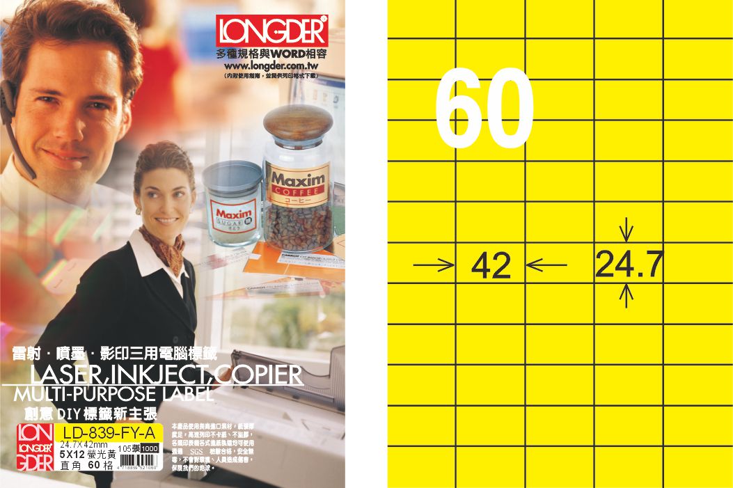 商品名稱:龍德 LD-839-FY-A A4雷射影印標籤 螢光黃 / 盒
