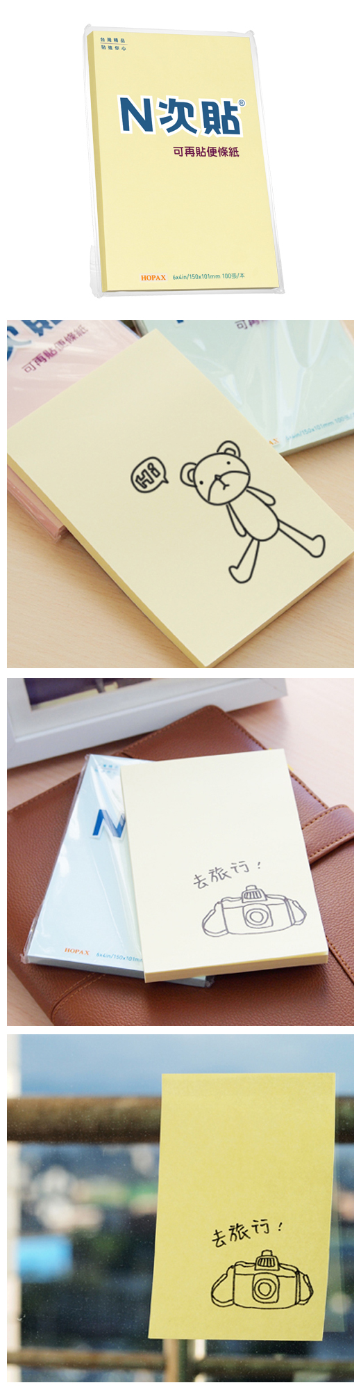 ◎品 名:N次貼 61133 標準型可再貼便條紙 6”x4”(152x101mm),黃◎單 位:100張/本◎型 號:61133◎規 格:6”x4”(152x101mm)◎顏 色:黃◎特 色:N次貼熱銷產品 標記提示輕鬆寫,分類備忘隨手貼 學習、筆記,好黏易撕重覆黏貼最便利!!