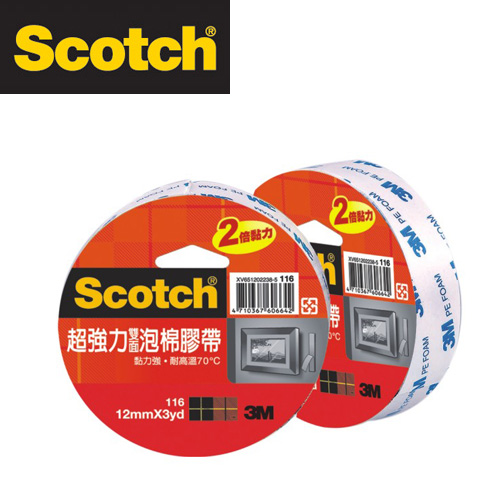 【商品名稱】3M 116 Scotch 超強力PE雙面泡棉膠帶12mmx3y / 個