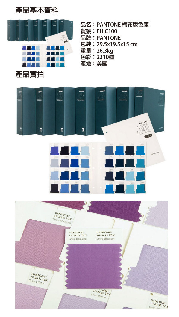 棉布版色庫對設計師、副總裁、高級配色師及各行業的創意設計人員都是不可或缺、頂尖的色彩工具。它是唯一能提供激發靈感及與之相關色彩,在世界各地都可一貫取得,並獲得技術支援的色彩工具。有了PANTONE服裝+家居色彩系統 [PANTONE Fashion + Home Color System],您的設計永遠都會符合潮流,符合時程,符合規格。