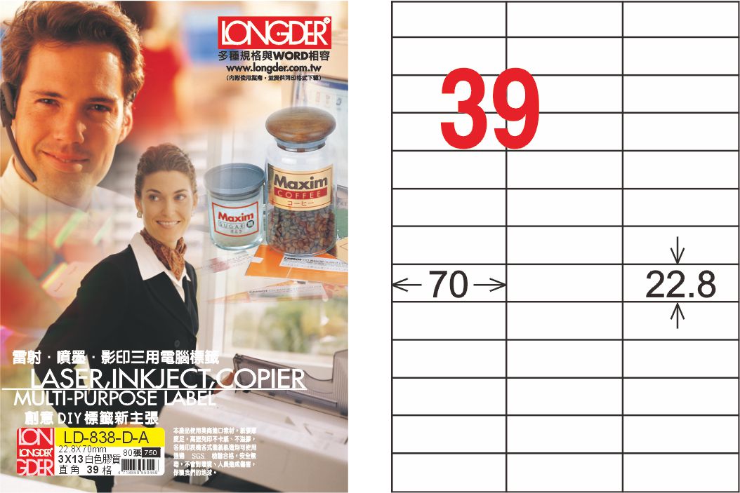 商品名稱:龍德 LD-838-D-A A4雷射影印標籤 白色PET / 盒