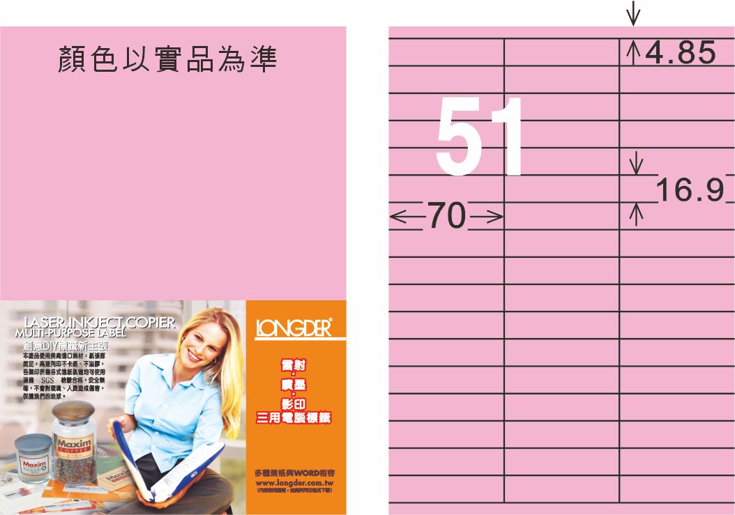 商品名稱:龍德 LD-829-R-C A4三用電腦標籤 粉紅色 / 包