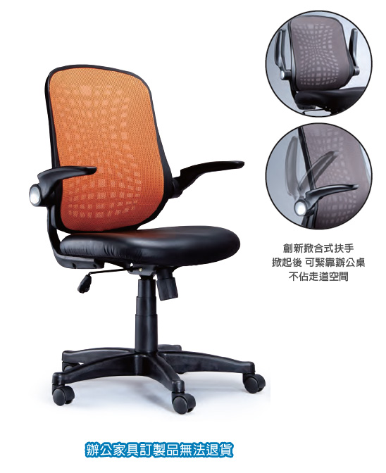 ◎特色:創新掀合式扶手,掀起後可緊靠辦公桌,不佔走道空間