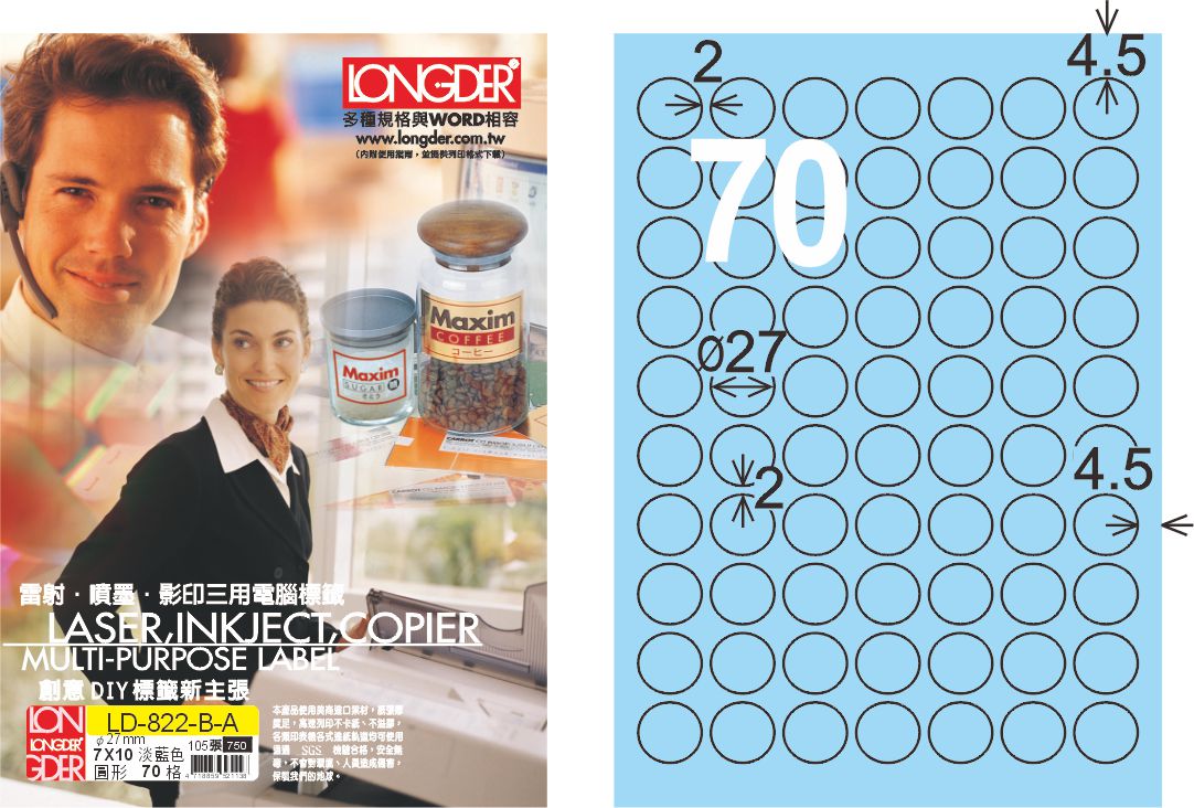 商品名稱:龍德 LD-822-B-A A4三用電腦標籤 淺藍色 / 盒