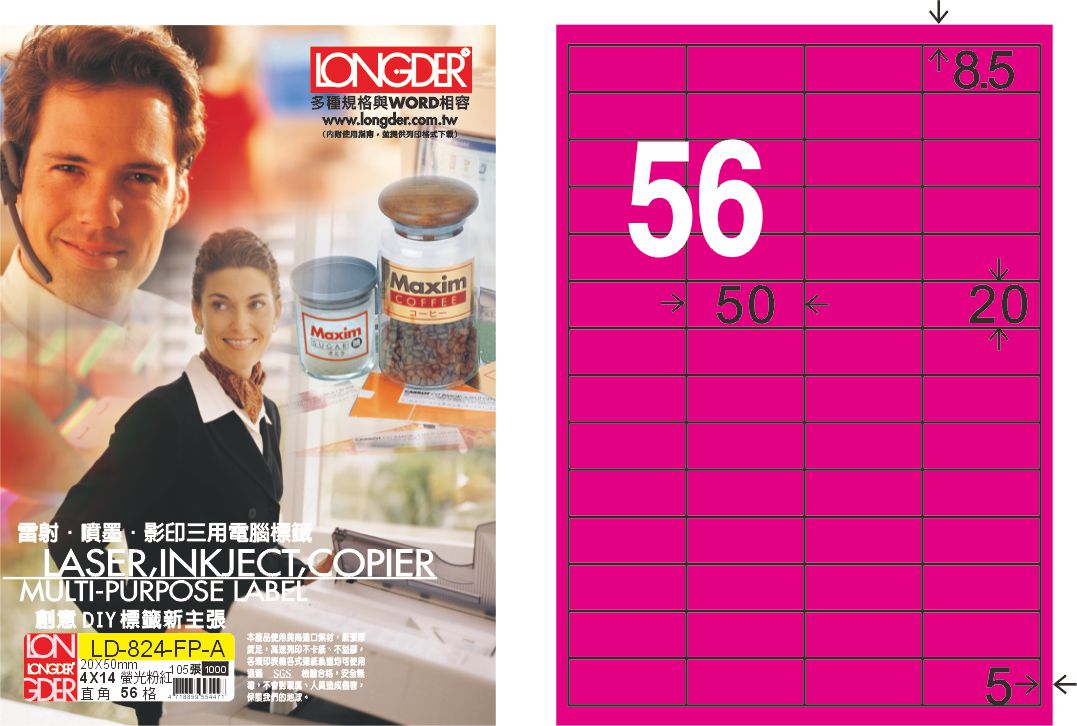 商品名稱:龍德 LD-824-FP-A A4雷射影印標籤 螢光粉紅 / 盒