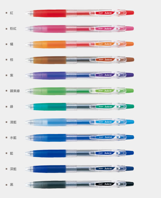 ◎品名:PILOT 百樂 LJU-10EF 0.5mm Juice 果汁筆◎單位:支◎球珠徑:0.5mm◎筆跡幅度:0.31-0.28mm◎尺寸:全長143mm◎替芯:LP2RF-EF◎墨水:顏料◎顏色:紅、粉紅、橘、棕、紫、蘋果綠、綠、淺藍、水藍、藍、深藍、黑 12種可選◎廠商介紹: