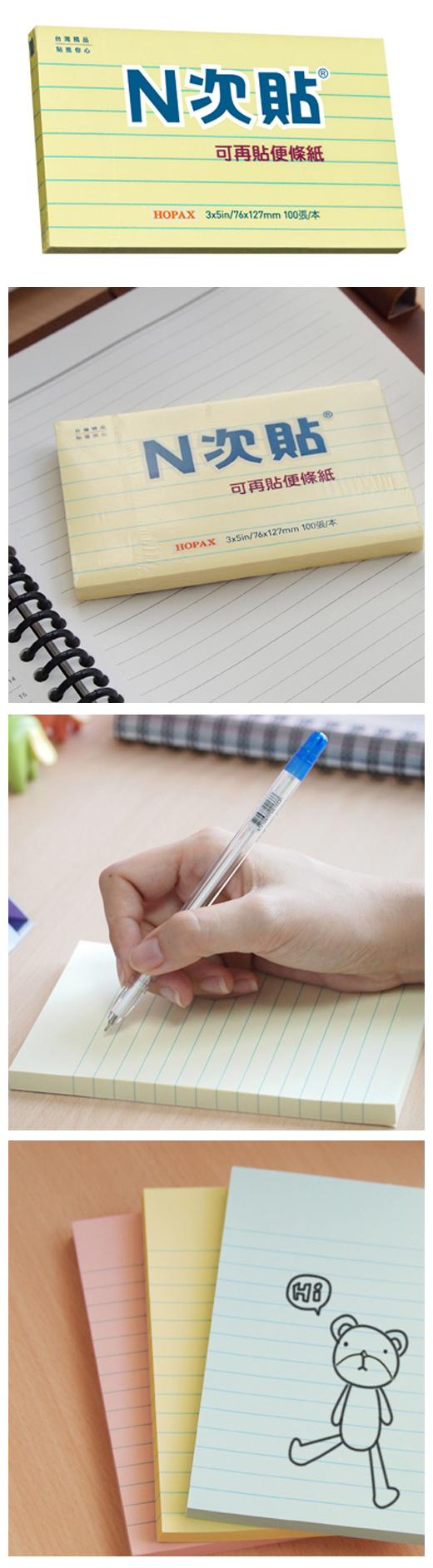 ◎品 名:N次貼 61719 格線型可再貼便條紙 3”x5”(76x127mm),黃◎單 位:100張/本◎型 號:61719◎規 格:3”x5”(76x127mm)◎顏 色:黃◎特 色:N次貼熱銷產品 標記提示輕鬆寫,分類備忘隨手貼 留言、註記、傳遞訊息,格線印刷、條列書寫方便!!