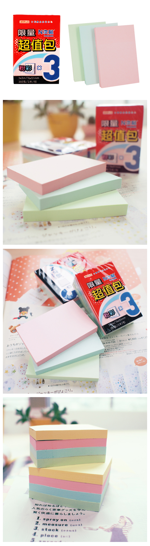 ◎品 名:N次貼 61002 超值包可再貼便條紙 3"x2"(76x51mm),粉紅/藍/綠◎單 位:300張/3本◎型 號:61002◎規 格:3"x2"(76x51mm)◎顏 色:粉紅/藍/綠◎特 色:最暢銷顏色,最實用款式,一本三包,經濟實惠,超值首選!