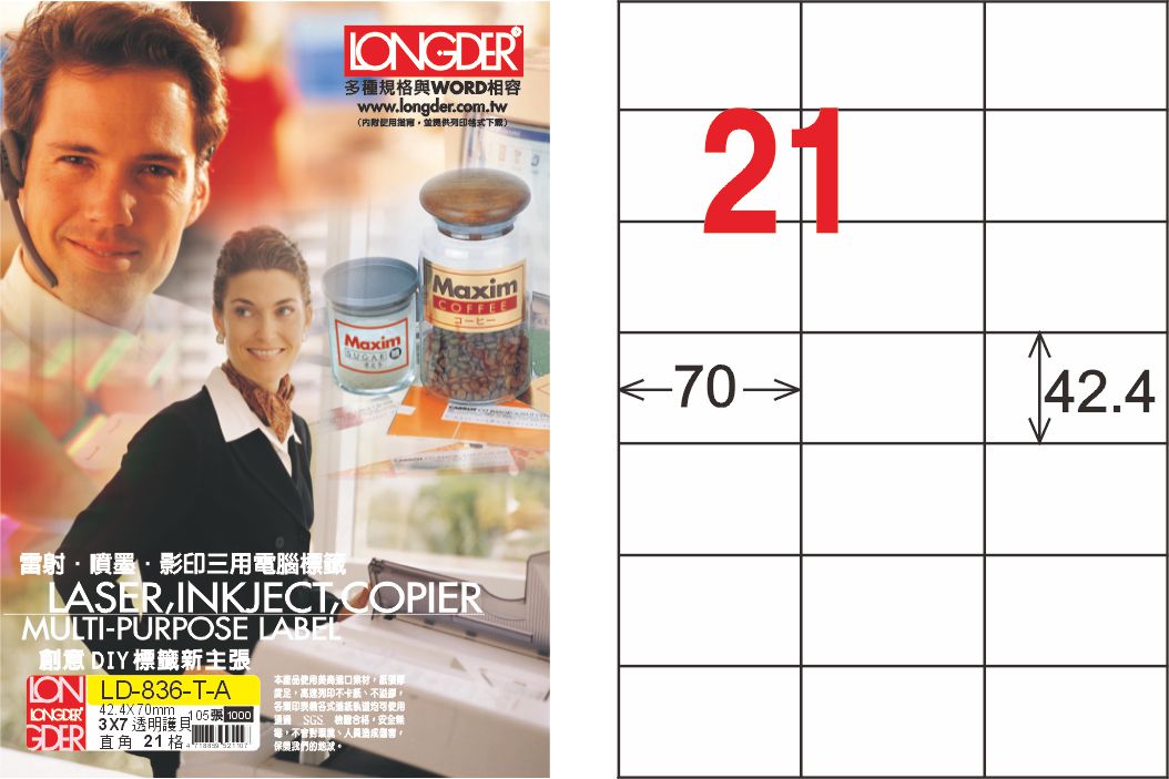 商品名稱:龍德 LD-836-T-A A4透明護貝膜標籤(不可列印) / 盒