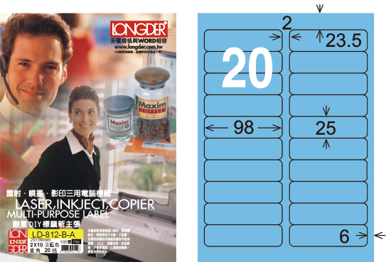 商品名稱:龍德 LD-812-B-A A4三用電腦標籤 淺藍色 / 盒