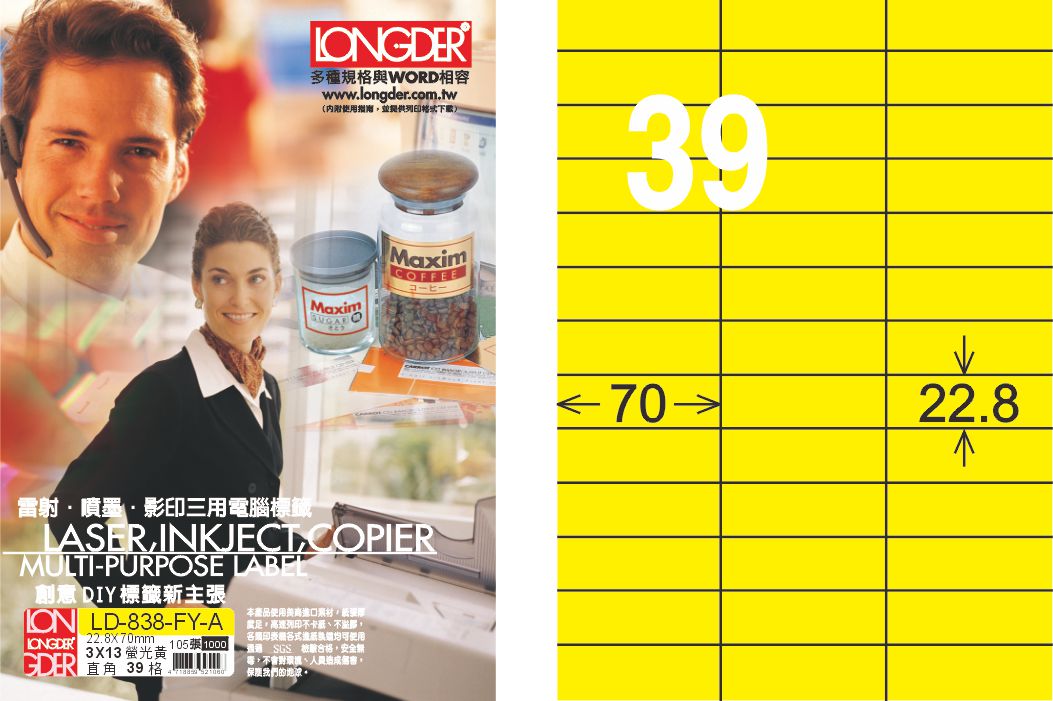 商品名稱:龍德 LD-838-FY-A A4雷射影印標籤 螢光黃 / 盒