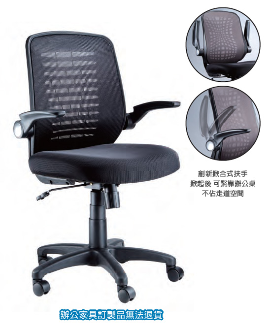 ◎特色:創新掀合式扶手,掀起後可緊靠辦公桌,不佔走道空間