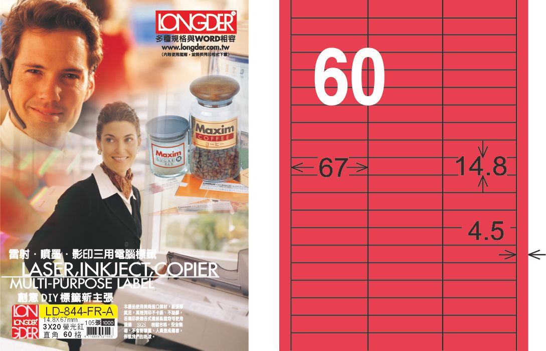 商品名稱:龍德 LD-844-FR-A A4雷射影印標籤 螢光紅 / 盒