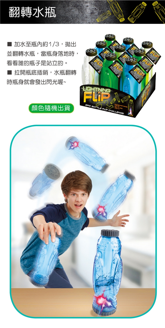 拋出並翻轉水瓶,當瓶身落地時,看看誰的瓶子是站立的!拉開瓶底插銷,
