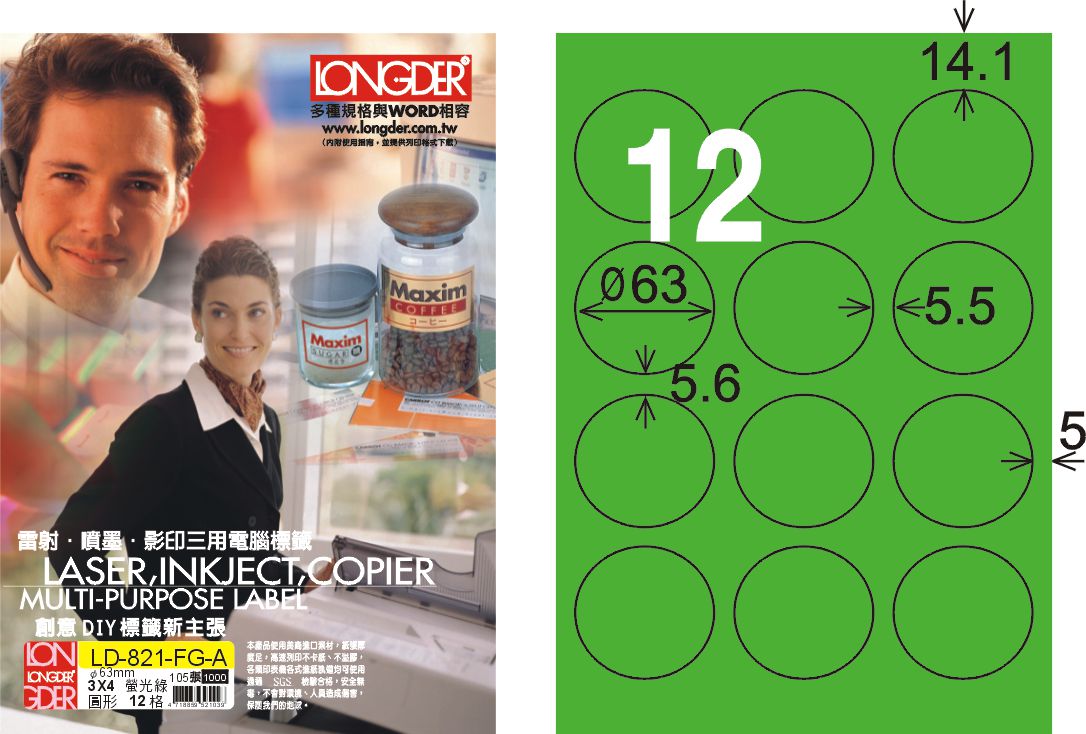 商品名稱:龍德 LD-821-FG-A A4雷射影印標籤 螢光綠 / 盒
