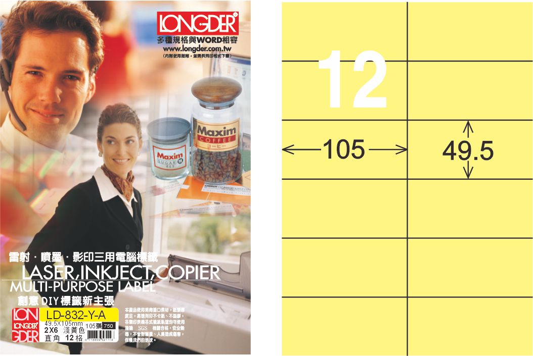 商品名稱:龍德 LD-832-Y-A A4三用電腦標籤 淺黃色 / 盒