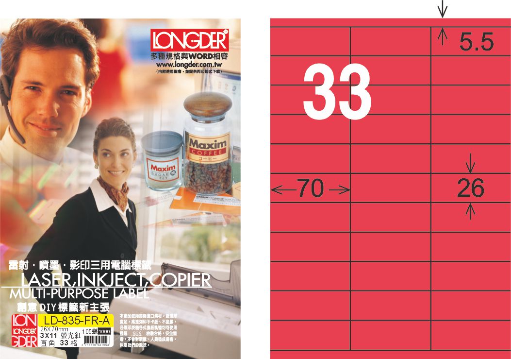 商品名稱:龍德 LD-835-FR-A A4雷射影印標籤 螢光紅 / 盒