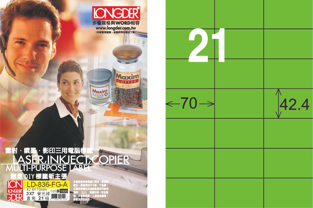 商品名稱:龍德 LD-836-FG-A A4雷射影印標籤 螢光綠 / 盒