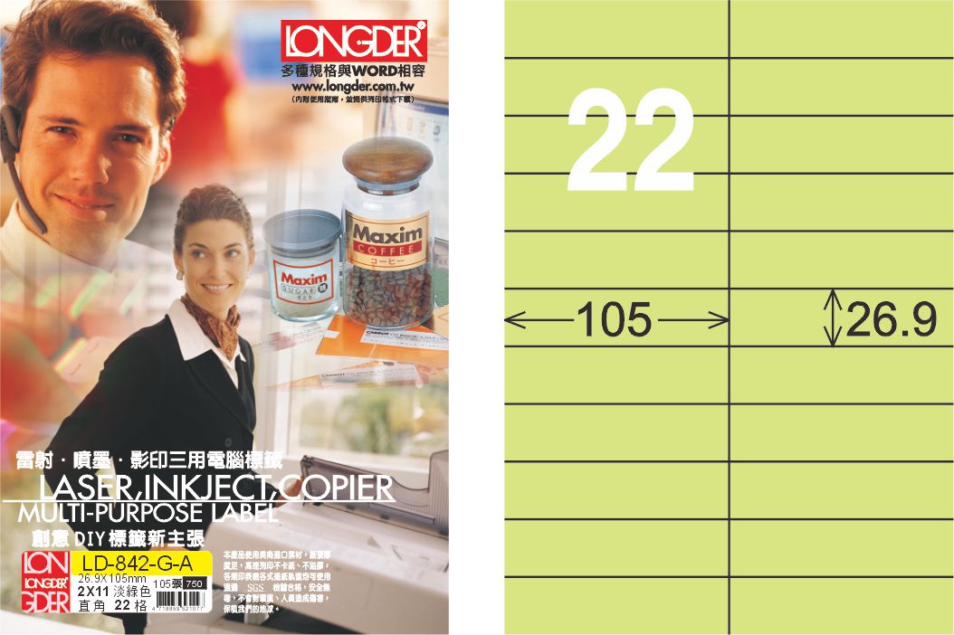 商品名稱:龍德 LD-842-G-A A4三用電腦標籤 淺綠色 / 盒