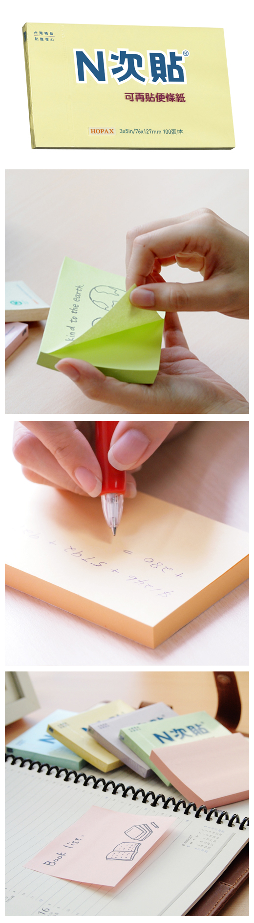 ◎品 名:N次貼 61127 標準型可再貼便條紙 3"x5"(76x127mm),黃◎單 位:100張/本◎型 號:61127◎規 格:3"x5"(76x127mm)◎顏 色:黃◎特 色:N次貼熱銷產品 標記提示輕鬆寫,分類備忘隨手貼 學習、筆記,好黏易撕重覆黏貼最便利!!