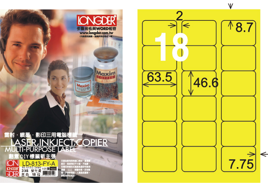 商品名稱:龍德 LD-813-FY-A A4雷射影印標籤 螢光黃 / 盒