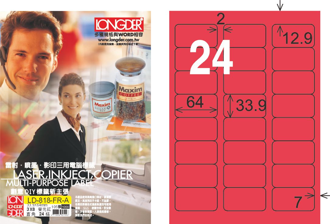 商品名稱:龍德 LD-818-FR-A A4雷射影印標籤 螢光紅 / 盒