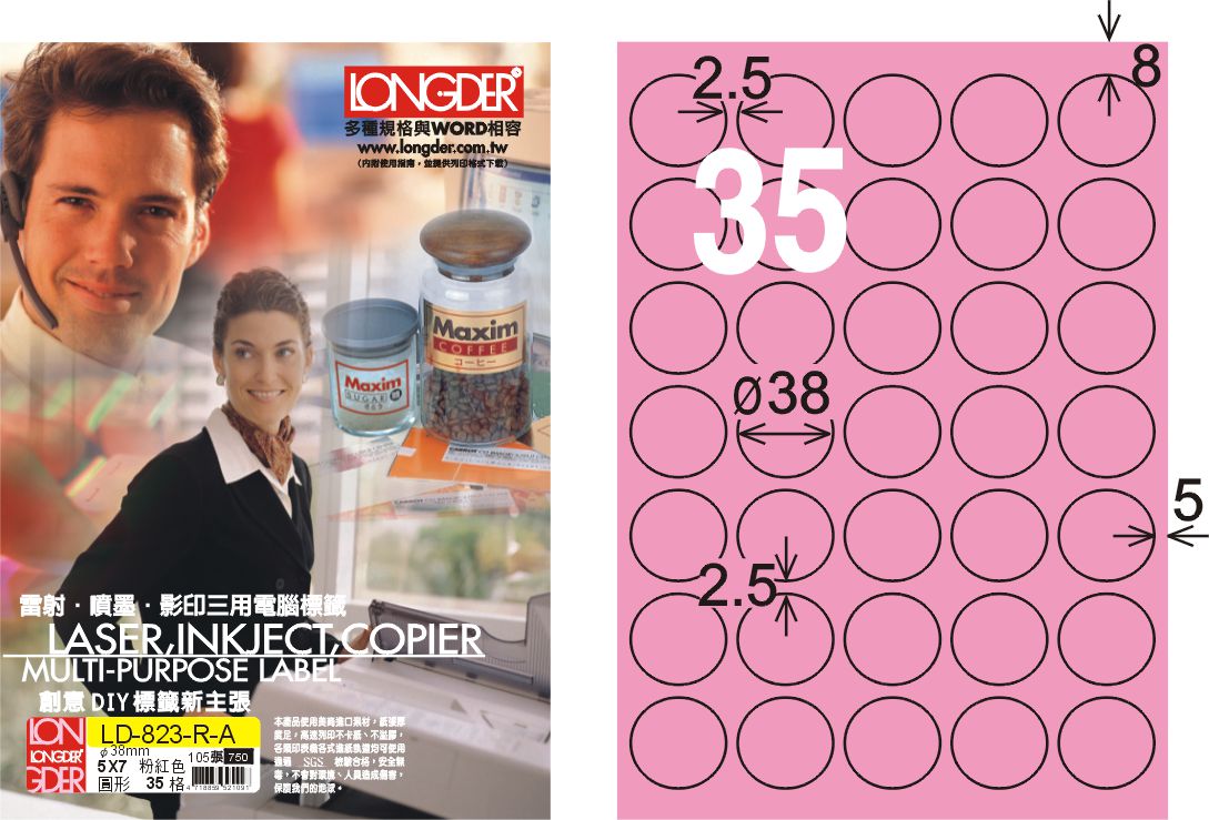 商品名稱:龍德 LD-823-R-A A4三用電腦標籤 粉紅色 / 盒