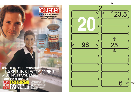 商品名稱:龍德 LD-812-G-A A4三用電腦標籤 淺綠色 / 盒