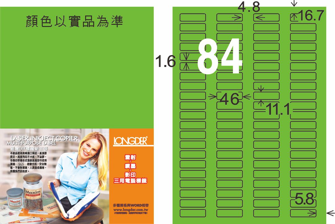 商品名稱:龍德 LD-827-FG-C A4雷射影印標籤 螢光綠 / 包