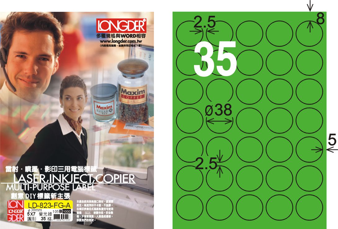 商品名稱:龍德 LD-823-FG-A A4雷射影印標籤 螢光綠 / 盒