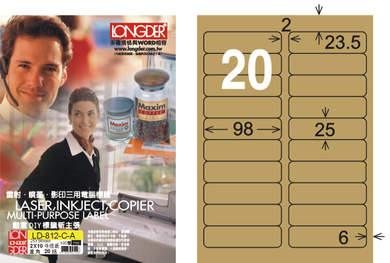 商品名稱:龍德 LD-812-C-A A4三用電腦標籤 牛皮紙 / 盒