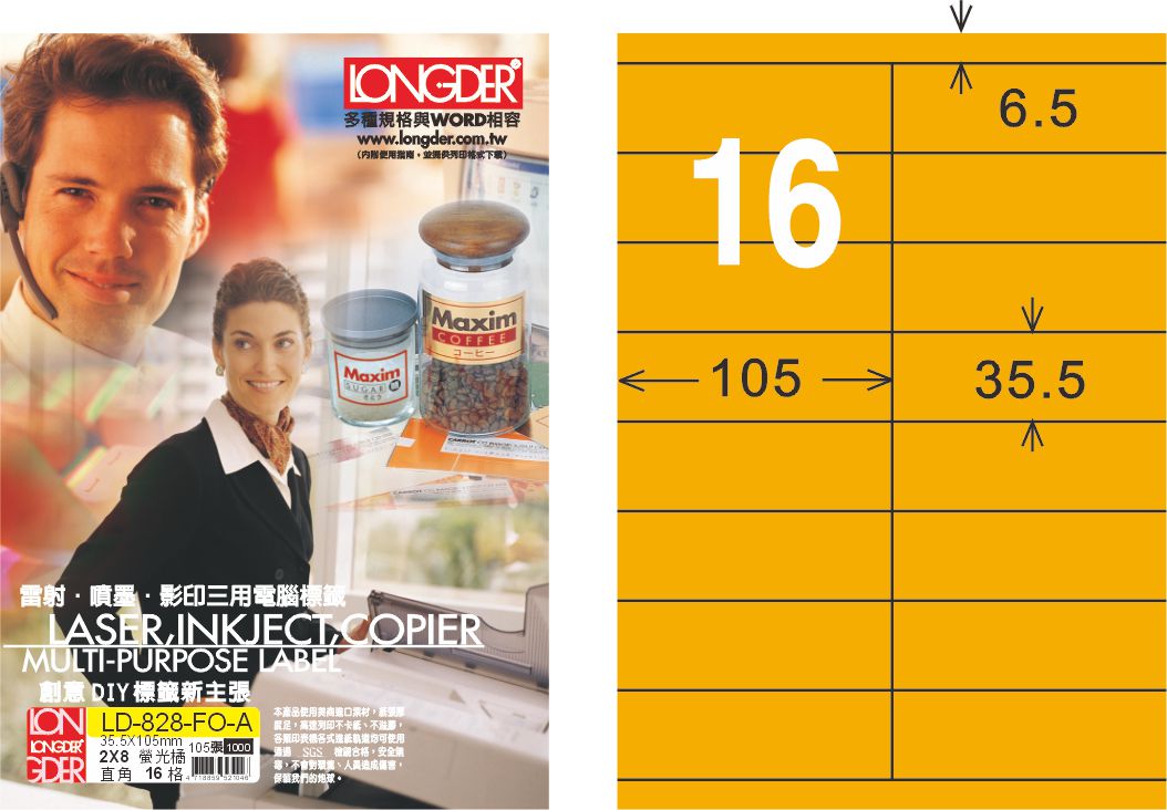 商品名稱:龍德 LD-828-FO-A A4雷射影印標籤 螢光橘 / 盒