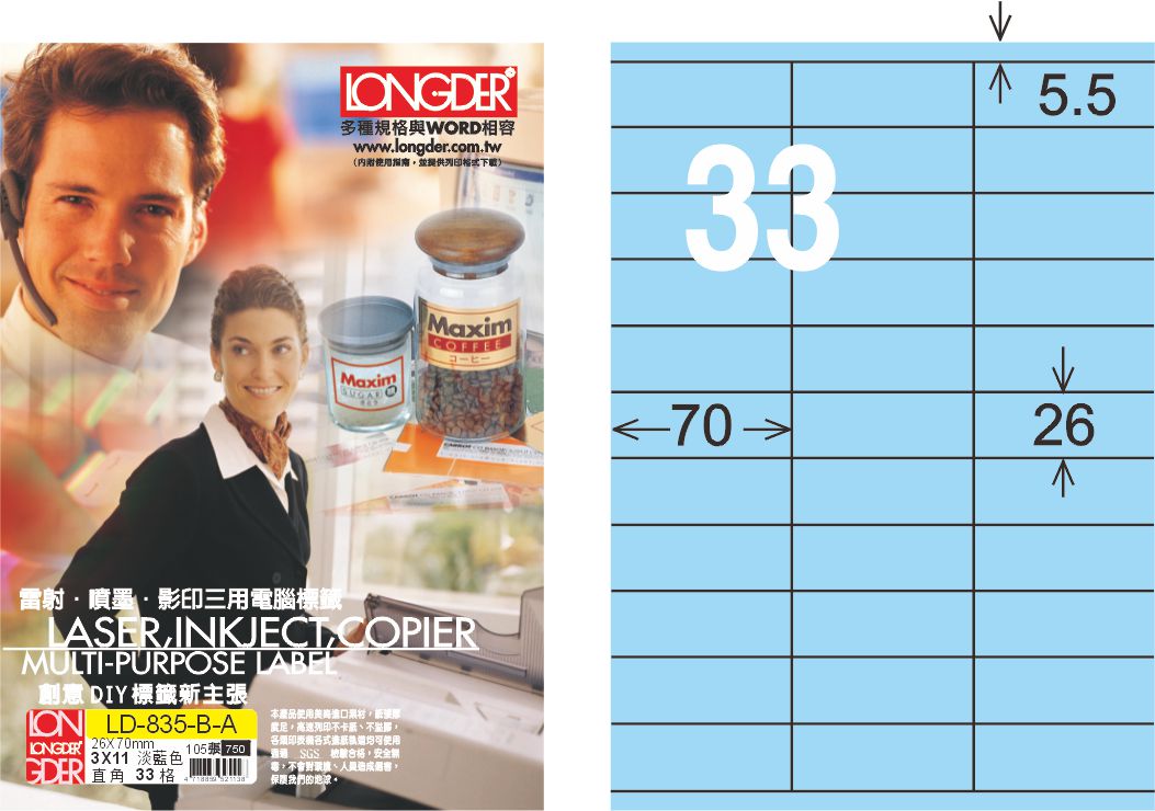 商品名稱:龍德 LD-835-B-A A4三用電腦標籤 淺藍色 / 盒