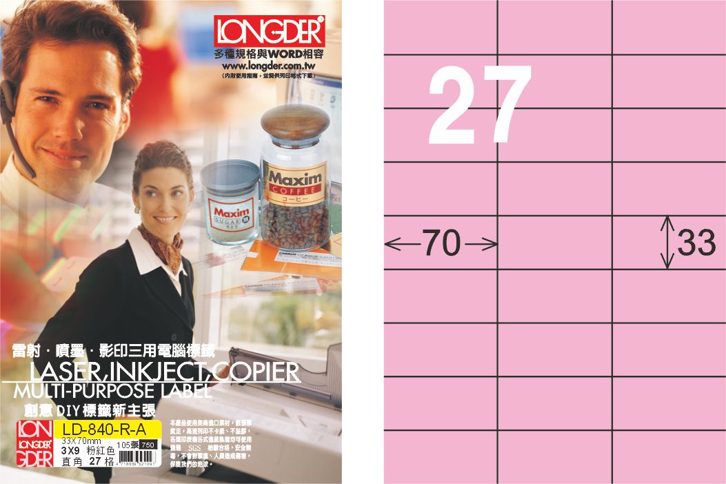 龍德 LD-840-R-A A4三用電腦標籤 粉紅色 / 盒