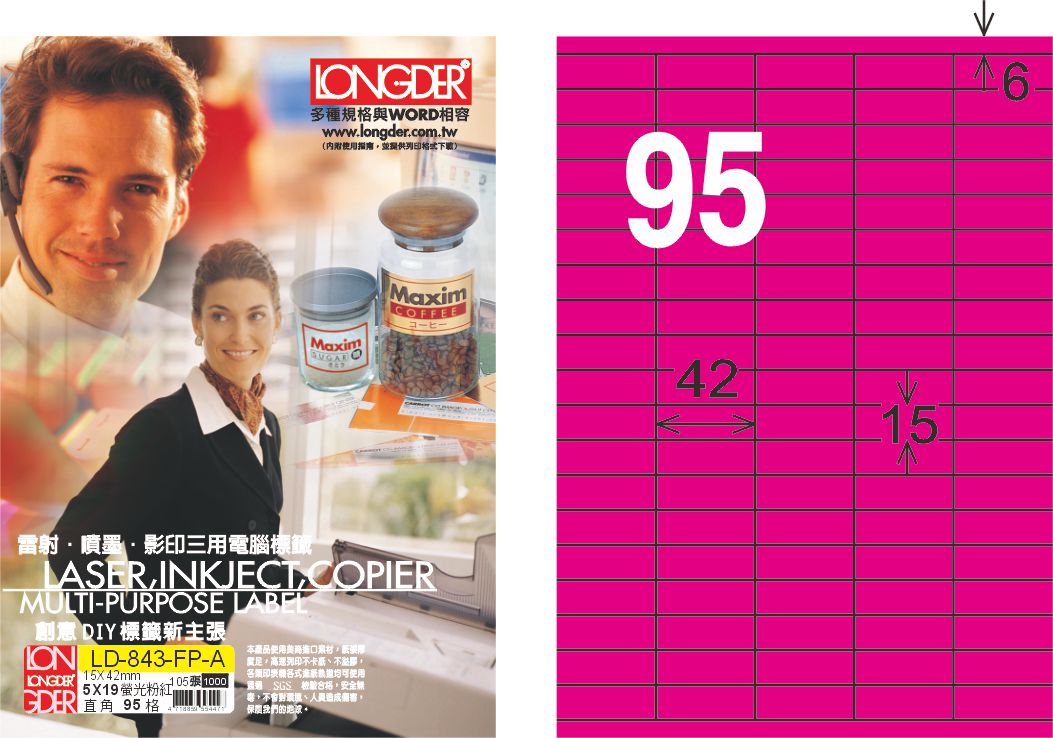 商品名稱:龍德 LD-843-FP-A A4雷射影印標籤 螢光粉紅 / 盒