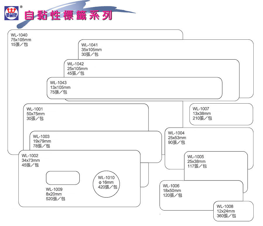 商品名稱:【華麗牌】WL-1042自黏標籤紙 (25x105mm) 45張/包商品單位:包商品型號:WL-1042商品特色: 白色無外框線標籤 適用黏貼在紙張或塑膠表面文件檔案夾/索引/商品標示/規格/分類等各種標示黏貼之用
