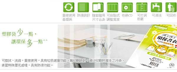 ◎ 特 色:● 可擦拭、洗滌,重複使用,具有垃圾減量功能