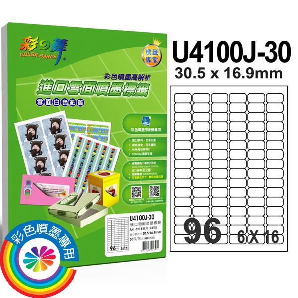 >{振昌文具}【請先來電洽詢庫存】彩之舞 U4100J-30 進口雪面噴墨標籤 6x16/96格圓角(30.5*16.9mm) - 30張/包